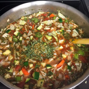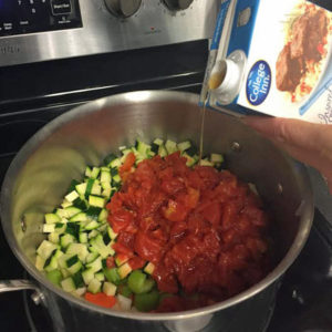 - Place carrots, onions, tomatoes, zucchini and cabbage in a large pot.