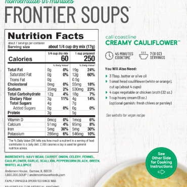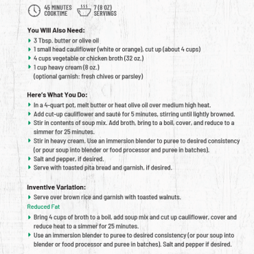 NEW FLAVOR! Cali Coastline Creamy Cauliflower Soup is a delectable and delicately balanced blend of herbs and spices that enhance cauliflower’s natural mild, nutty taste. Ready in just 45 minutes.