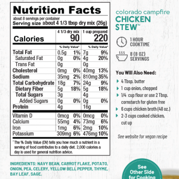 Colorado Campfire Chicken Stew is a blend of peas, carrots, potatoes and white beans with just the right seasoning for a soup as thick and rich as the inside of a chicken pot pie. Add chicken and you’ll see why this hearty gluten free stew is a top seller.