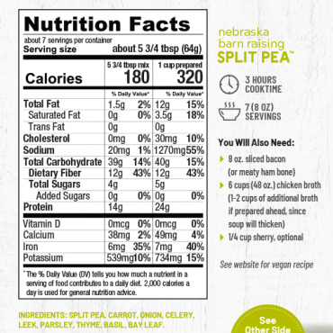 Nebraska Barnraising Split Pea Soup features seasoning and a carrot vegetable mixture that complement the finest green split peas. Bacon or ham are popular additions to this classic thick split pea soup. Add a dash of sherry, if desired!